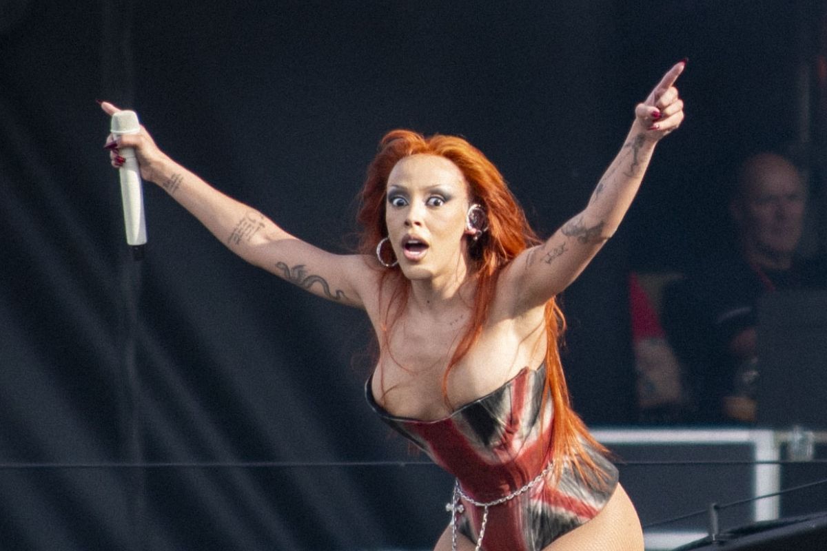 Pyro blasts behind her light the frame like she’s performing on the mouth of a volcano.